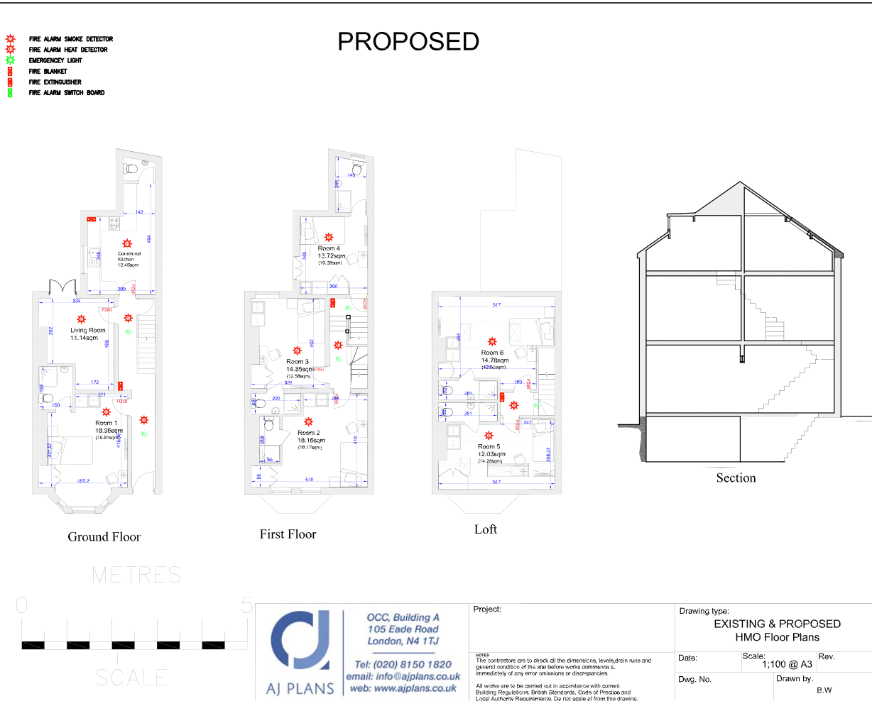 The proposed plans outline the intended modifications and enhancements to transform the property into a fully functional HMO. These plans are designed to meet all relevant regulations and standards, ensuring safety, accessibility, and comfort for future occupants. They include detailed layouts of the new configurations, showing the reallocation of spaces, the addition of necessary facilities, and any structural changes required. Additionally, our proposed plans clearly show the fire safety requirements, including escape routes, fire doors, and alarm systems, ensuring compliance with safety standards. The dimensions of the plans are meticulously detailed to ensure precision in execution.